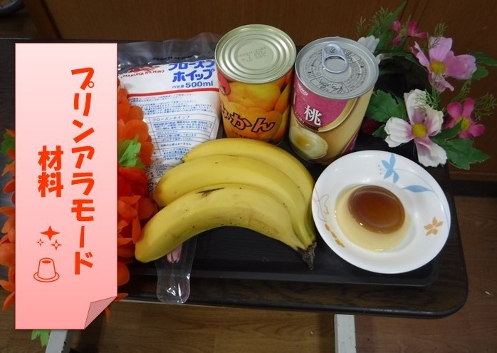 プリン、バナナ、桃缶、みかん缶、ホイップクリームなど。