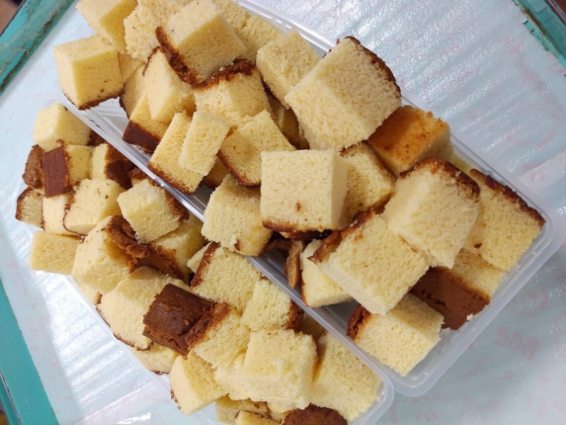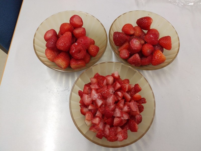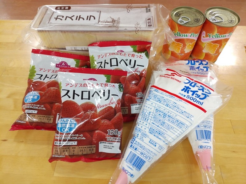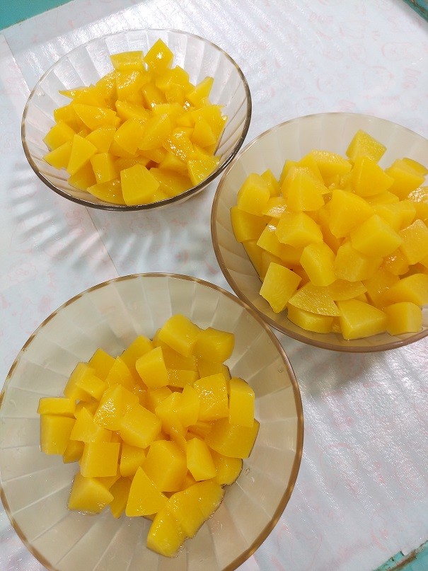 カステラ、黄桃も食べやすい大きさにカット🔪