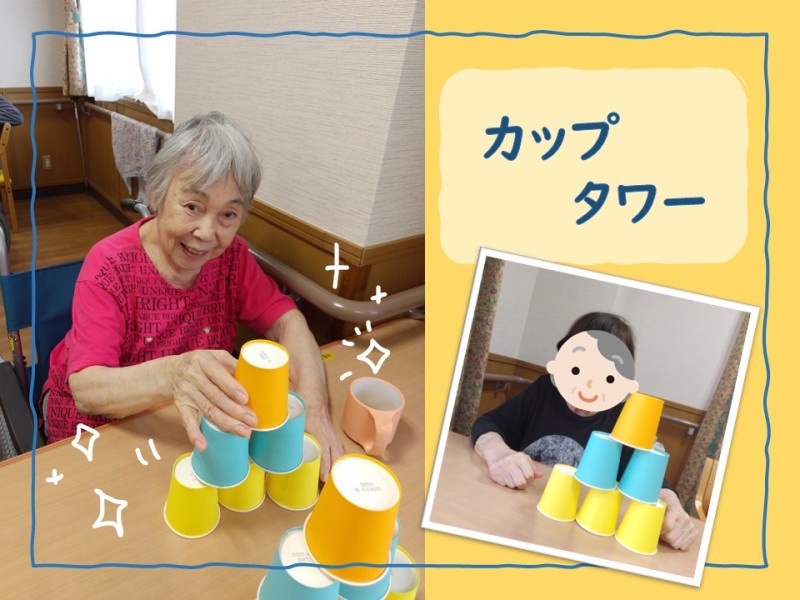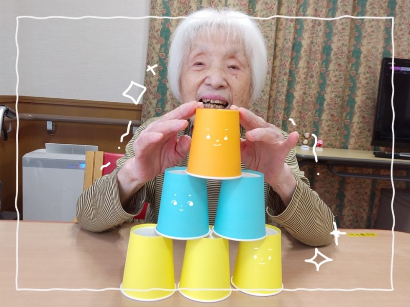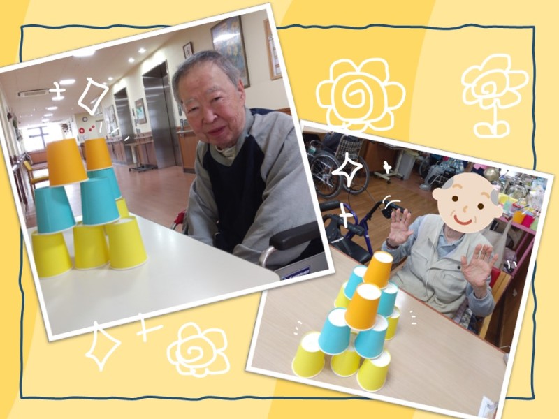 入所ではカップタワーのレクリエーションを