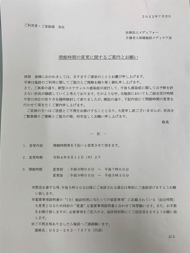 先日、ご利用者・ご家族様にはご案内を送付させていただいておりますが