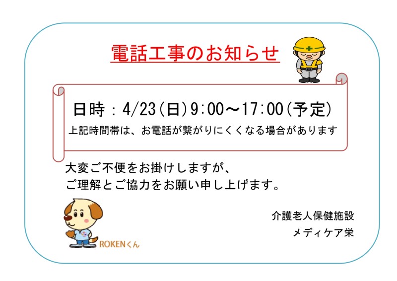 HOME > お知らせ > 電話工事のお知らせ